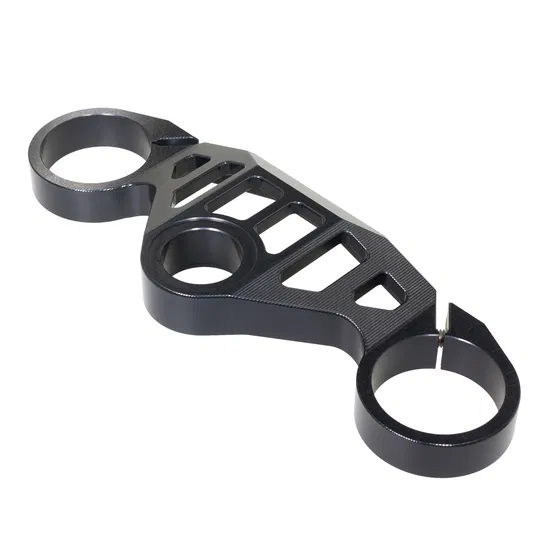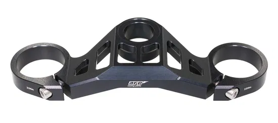 Die hochwertige Oberflächenveredelung (z. B. Harteloxierung in Schwarz) sorgt nicht nur für eine edle Racing-Optik, sondern schützt die Gabelbrücke zuverlässig vor Korrosion und äußeren Einflüssen – ideal für Straße und Rennstrecke.