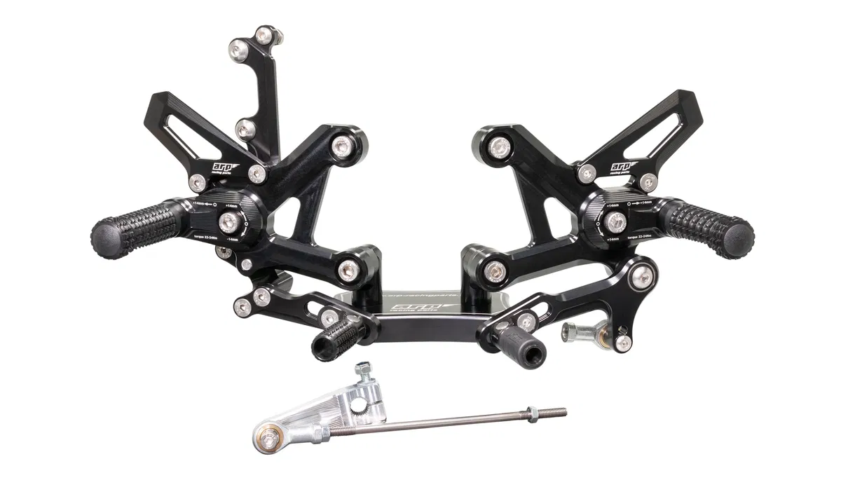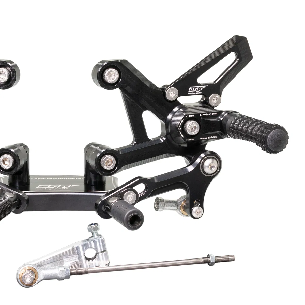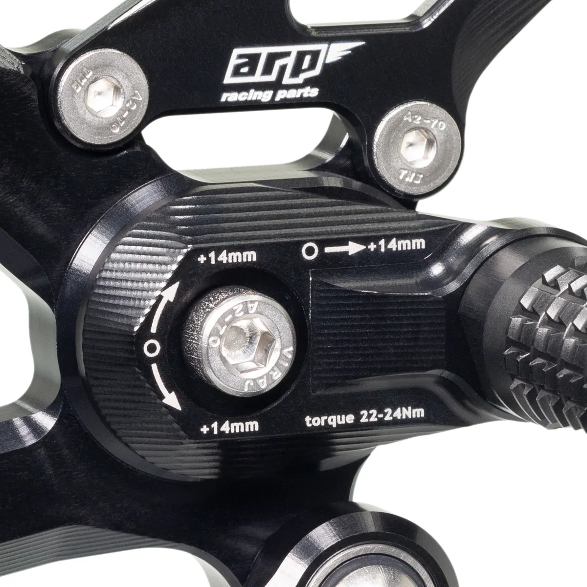 ARP entwirft Fußrastenanlagen unter Berücksichtigung von vier Schlüsselbereichen: Funktionalität, Haltbarkeit, Design und Einfachheit, wobei die Funktionalität am wichtigsten ist. Unsere Fußrastenanlagen bieten dem Fahrer hervorragendes Feedback, sodass er sein Motorrad bis an die Grenzen bringen kann. Wir fertigen unsere Fußrastenanlagen aus Aluminiumblöcken, die im Vergleich zu den OEM-Fußrastenanlagen eine außergewöhnliche Haltbarkeit und Steifigkeit bieten. Die Oberfläche der Hauptteile ist eloxiert, um ein hartes schwarzes Finish für zusätzlichen Schutz vor Kratzern und Umwelteinflüssen zu erzielen.