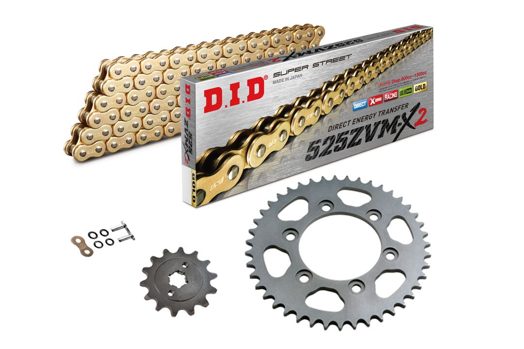 Kettensatz DID 525ZVM-X2, Farbe gold, Kettenlänge 108 Glieder, Übersetzung 17x42, für Aprilia Tuono 1000 Fighter, Modelljahr 2003-2005