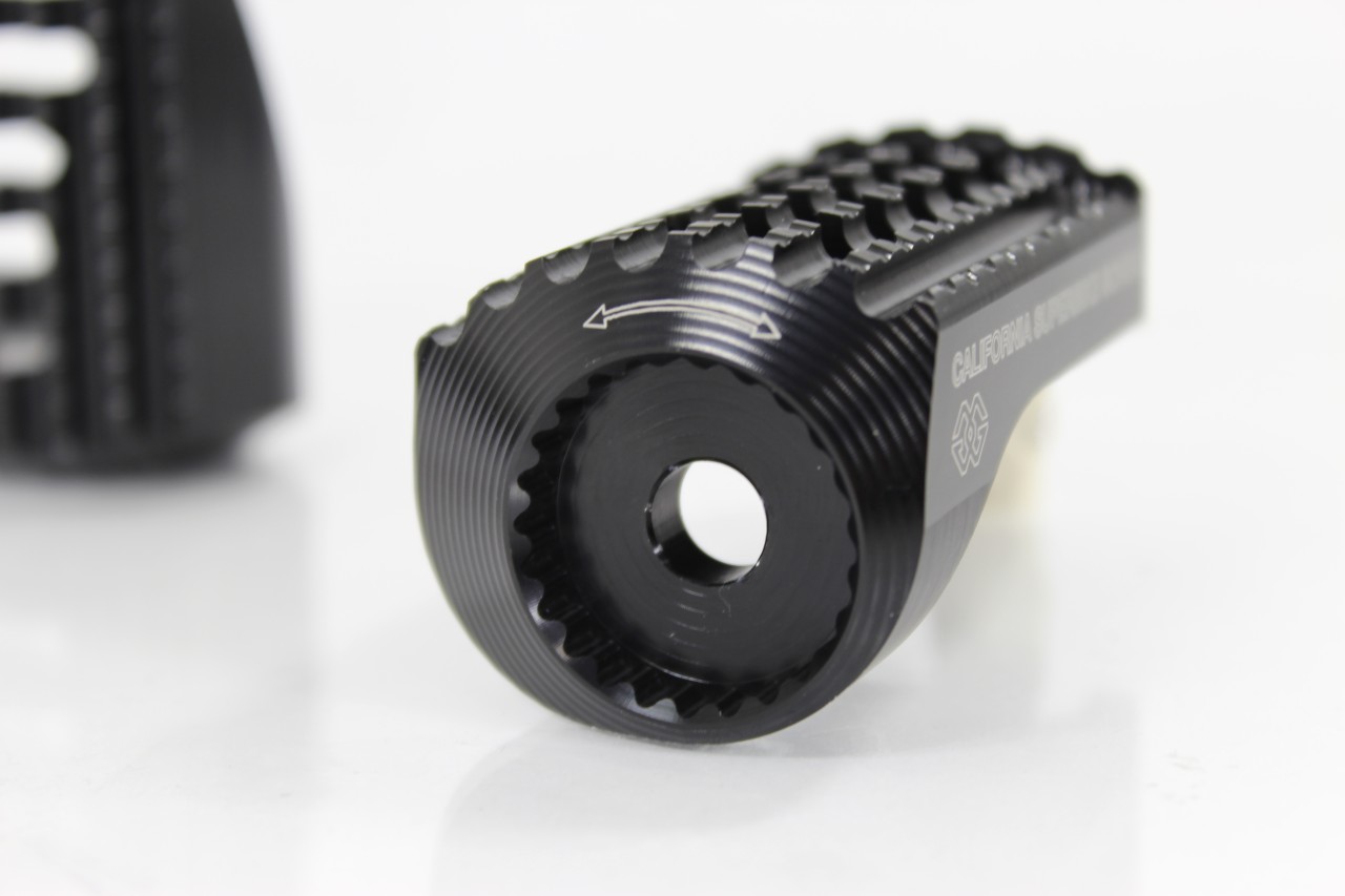 Die Raste hat ein einzigartiges, patentiertes Design mit abgeschrägten Außenseiten. Auf der abgeschrägten Außenseite findet man bei Kurvenfahrten und besonders beim Hanging Off überragenden Grip, was sich in mehr Sicherheit bei hohen Schräglagen niederschlägt. Die Oberseite der Raste hat eine weitere Rundung als Standardrasten, wodurch den Sohlen mehr Kontaktfläche und somit ebenfalls der bestmögliche Grip geboten wird. Dank einer verzahnten Verbindung zum Rastengelenk kann die Oberseite der Raste in 15 Grad Schritten präzise ausgerichtet und fixiert werden. Mit dieser Raste fährt man in jeder Situation sicherer und souveräner. Optionale Ausleger können nicht montiert werden.