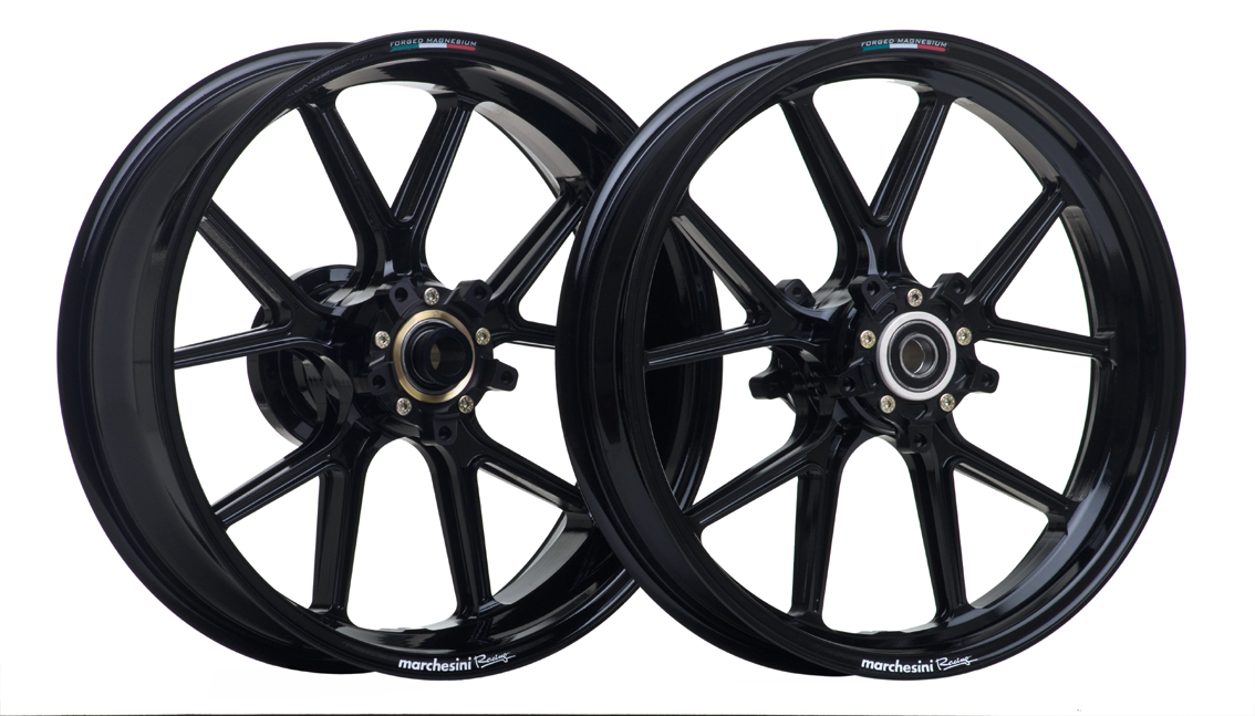Magnesiumfelgensatz, vorne und hinten, für Zweiarmschwinge im klassischen 10 - Speichen - Design, 17 Zoll, von Marchesini. Als Replica, wie erfolgreich in MotoGP, Moto2, Moto3, WSBK eingesetzt.